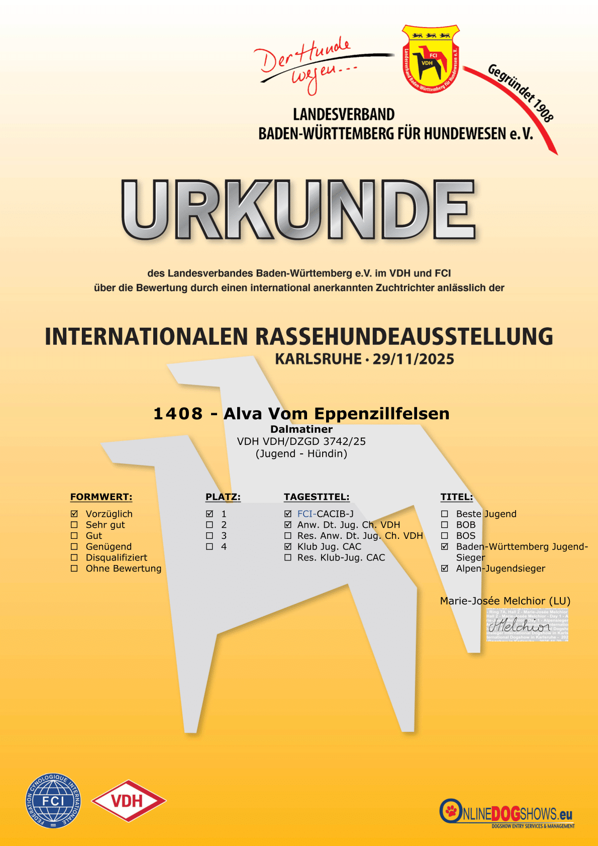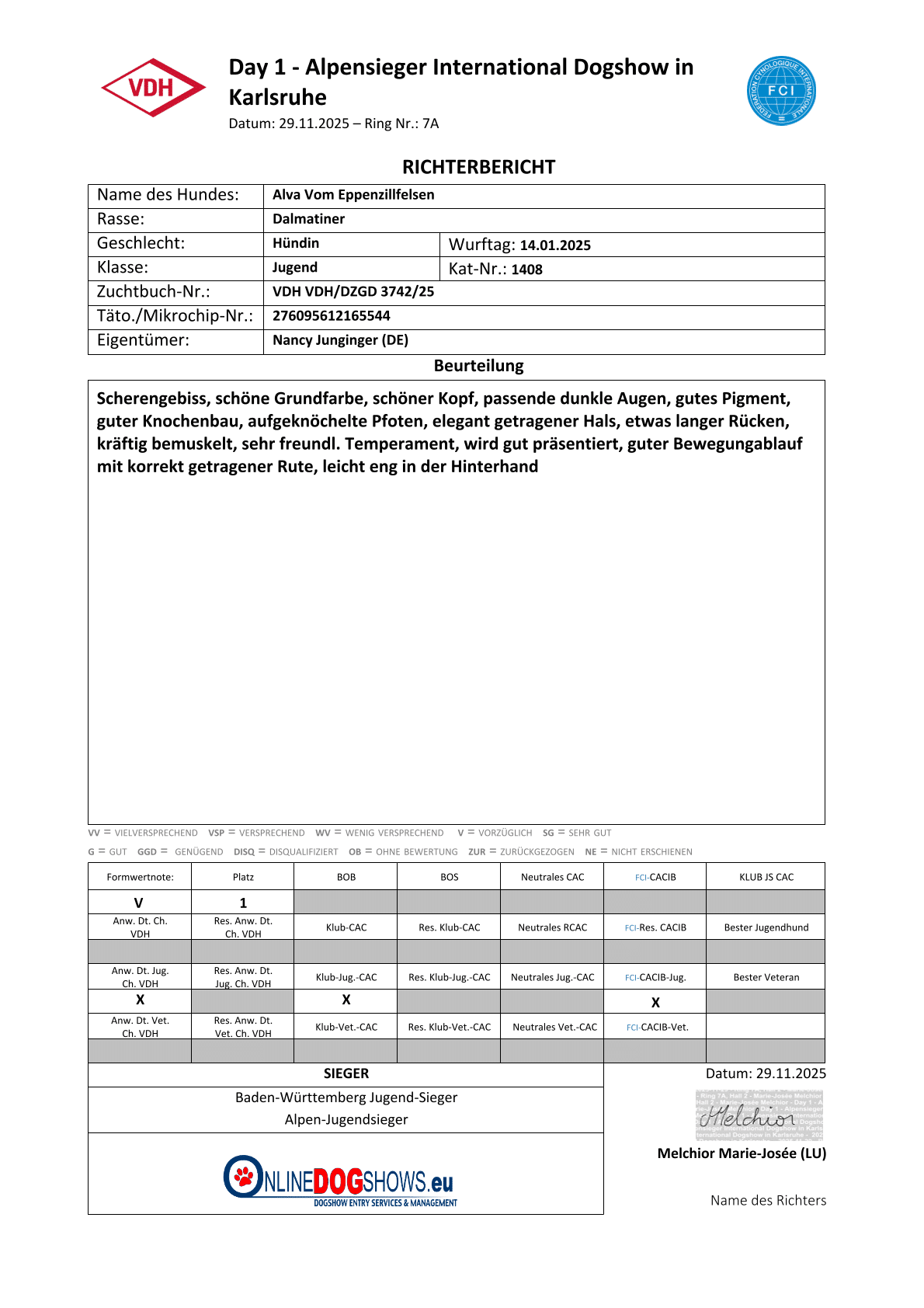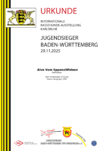 29.11.2025Internationale Rassehunde-Ausstellung KarlsruheJugendFr. Marie-Josee Melchior (LU)vorzüglich 1, Anw. Dt. Jug. Ch. VDH; Klub-Jug.-CAC; FCI-CACIB-Jug.