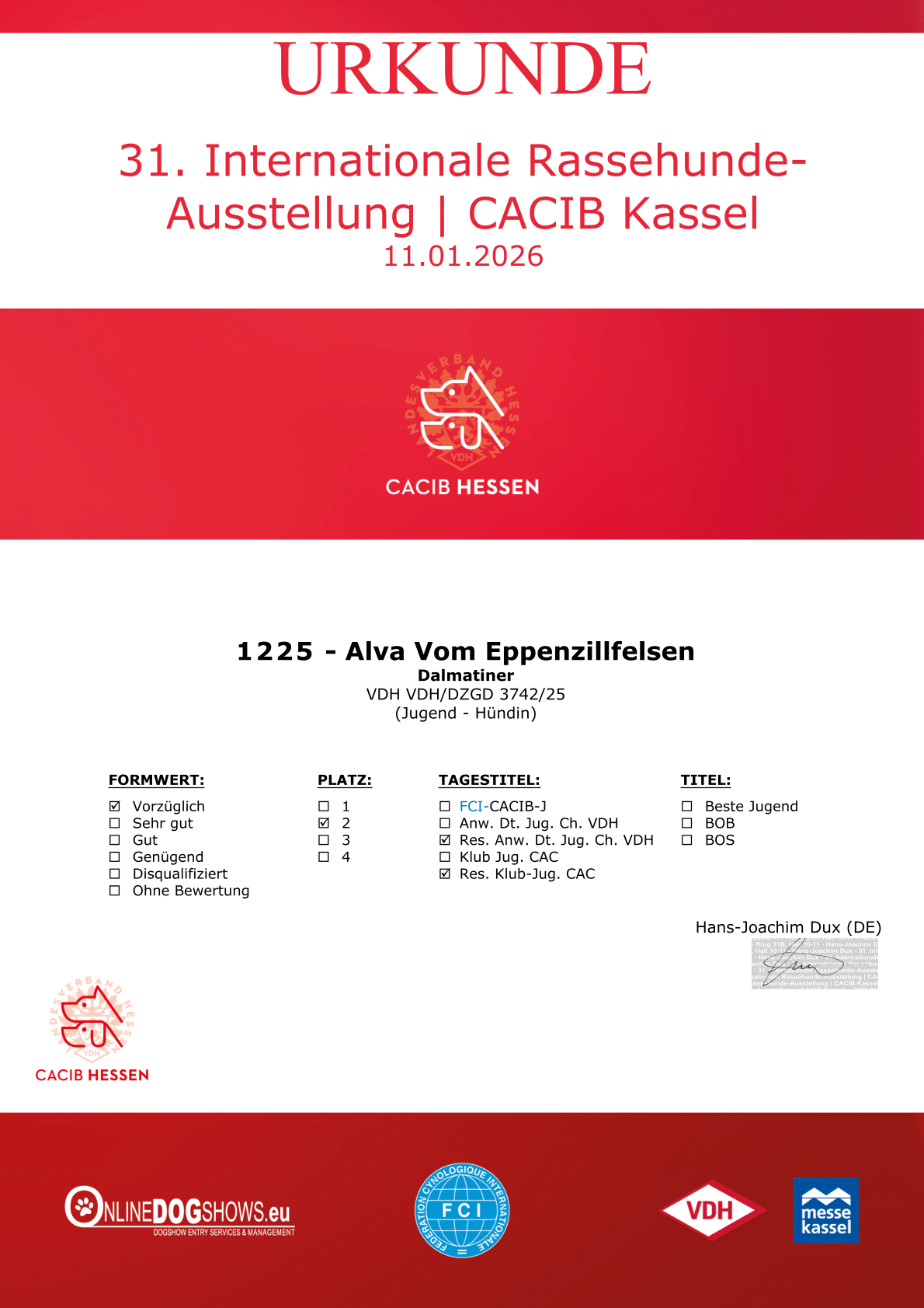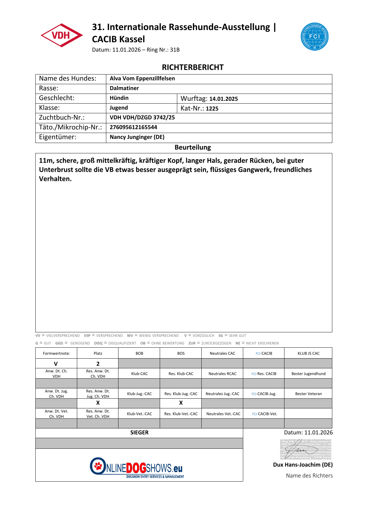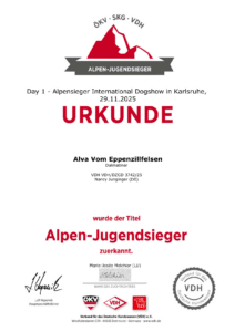 11.01.2026Internationale Rassehunde-Ausstellung KasselJugendHr. Hans-Joachim Dux (DE)vorzüglich 2, Res. Anw. Dt. Jug. Ch. VDH; Res. Klub-Jug.-CAC