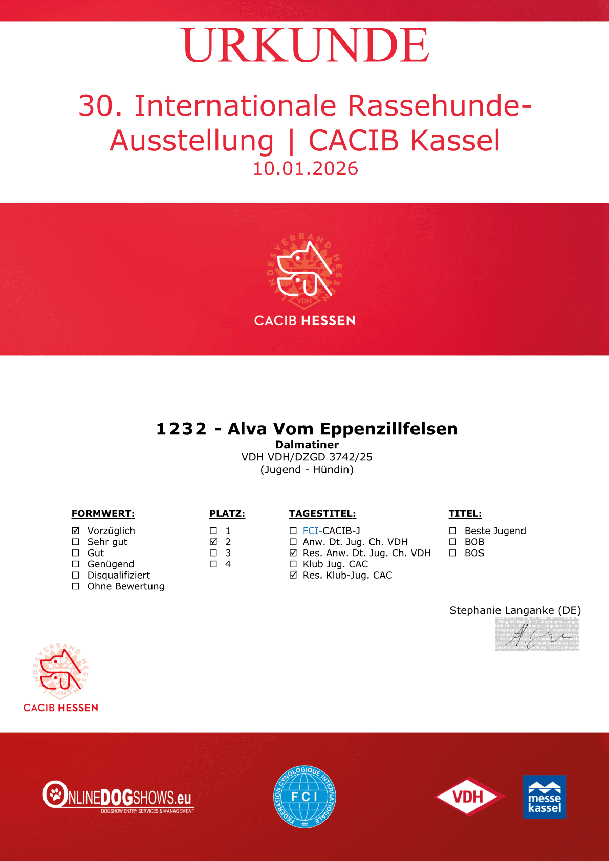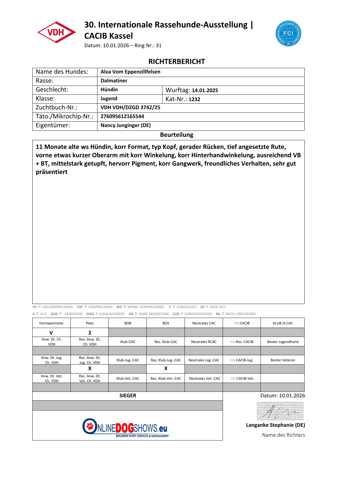 10.01.2026Internationale Rassehunde-Ausstellung KasselJugendFr. Stephanie Langanke (DE)vorzüglich 2, Res. Anw. Dt. Jug. Ch. VDH; Res. Klub-Jug.-CAC
