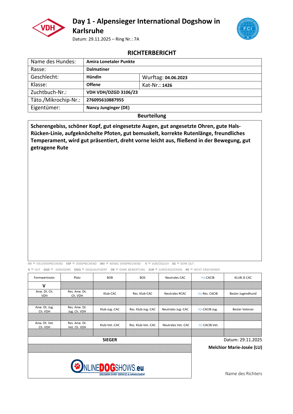 | 29.11.2025 | Internationale Rassehunde-Ausstellung Karlsruhe | Offene | Fr. Marie-Josee Melchior (LU) | vorzüglich |