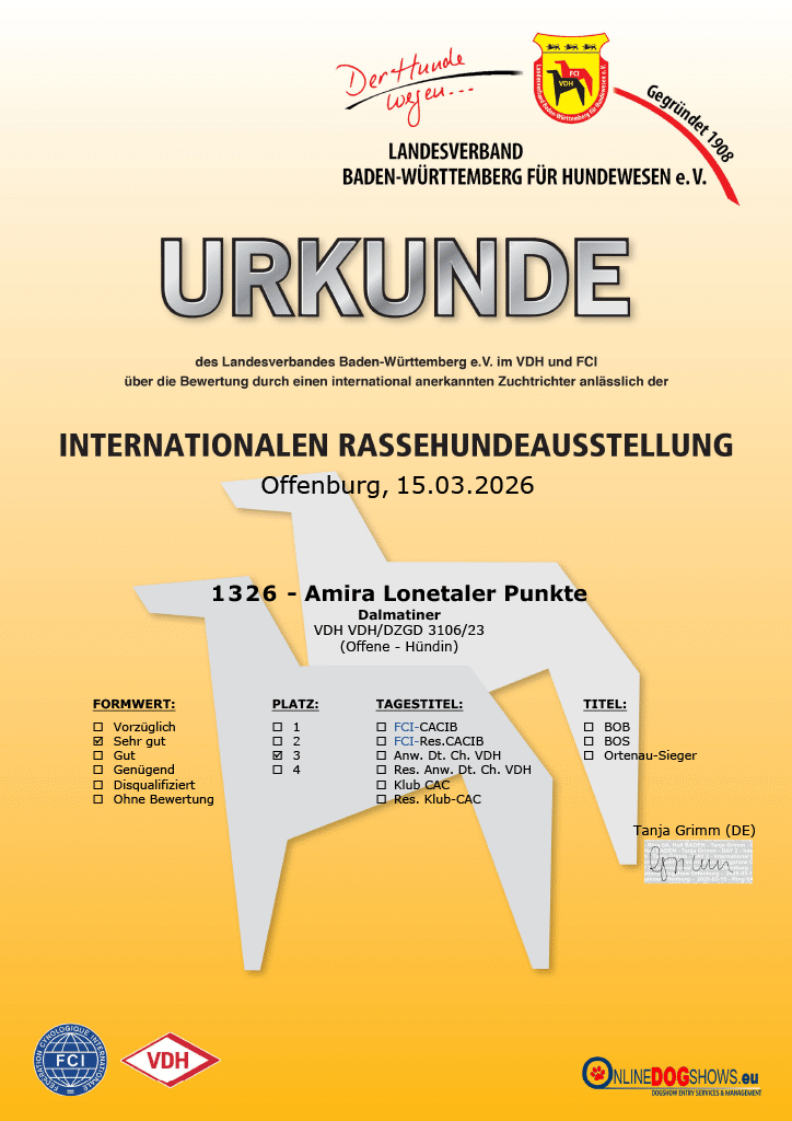 | 15.03.2026 | Internationale Rassehunde-Ausstellung Offenburg | Offene | Fr. Tanja Grimm (DE) | sehr gut 3 |